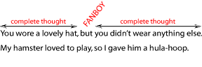 GOOD: You wore a lovely hat, for it was your only defense.ALSO GOOD: You wore a lovely hat; it was your only defense.STILL GOOD: You wore a lovely hat. It was your only defense.TOTALLY GOOD: You wore a lovely hat because it was your only defense.4. FANBOYS fakers